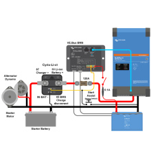 Het is gebruikelijk om de dynamo rechtstreeks op de startaccu aan te sluiten. De accessoire-accu en eventueel ook een boegschroefaccu en andere accu's worden allemaal aan de startaccu gekoppeld met een Cyrix-accuscheider. Wanneer de Cyrix vaststelt dat de startaccu de koppelspanning heeft bereikt, zorgt de Cyrix ervoor dat alle accu's parallel geladen worden.