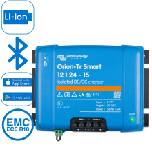 Door deze professionele 3stappen DC naar DC-acculader kan de extra accu in voertuigen of boten ondanks de wisselende dynamo spanning toch goed worden opgeladen. De Orion-Tr Smart kan via Bluetooth gemonitord en geprogrammeerd worden, en op afstand bediend worden via een externe aan/uit-schakelaar. Bovendien is het apparaat voorzien van een motorbedrijf-detectiemechanisme.