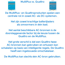 Deze nieuwste telg uit de MultiPlus familie is voorzien van een PowerControl en PowerAssist functionaliteit. Alle modellen zijn geschikt voor 3-fase en paralelle schakeling, en hebben een maximale doorschakelstroom van 32A. De omvormer/acculaders van Victron Energy zijn ontworpen voor professioneel gebruik. Ze zijn geschikt voor uiteenlopende apparaten met hoge en lage startvermogens. De MultiPlus is een multifunctioneel energiesysteem met sinus-omvormer, acculader en AC-omschakelaar. De accu’s worden veilig geladen, ook als de kwaliteit van de stroomvoorziening laag is.