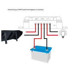Tussen het zonnepaneel en de PWM zit 1 meter bekabeling en tussen de te plaatsen accu en de PWM zit 2 meter bekabeling. De PWM zit er dus zwevend tussen.