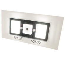 Wij monteren dan het artikel op het paneel en voorzien het aan de onderzijde van een sticker met daarop de juiste iconen/omschrijving (12V, dimbaar en/of USB) en het artikelnummer.