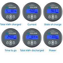 Naast de hoofdweergaveopties, zoals de spanning, de stroom en de verbruikte Ampère-uren, geeft de BMV-700 serie ook de laadstatus, de resterende tijd en het stroomverbruik in watt aan.