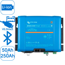 De nieuwe Victron Phoenix Smart lader 24/25 (1+1) IP43 120-240V heeft twee uitgangen. De eerste uitgang is een aanpasbare vijf-stappen-acculader die een oplading van 25A bij een 24V systeemspanning kan bieden. De tweede uitgang, gelimiteerd tot ongeveer 3A met een iets lagere uitgangsspanning, is bedoeld als onderhoudslader voor een startaccu. Voor oplading met compensatie voor voltage en temperatuur is de draadloze Smart Battery Sense (SBS050100200) te bestellen.