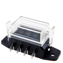 Schroefbare zekering houder voor 4 standaard steek zekeringen. De vlaksteker aansluiting 6,3mm is gepositioneerd aan de zijkant. Dit model wordt geleverd met deksel.