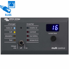 De Digital Multi Control wordt gebruikt om via afstandsbediening AC-invoerstromen te bekijken en aan te passen, en de Multi of Quattro in en uit te schakelen. Het werd ontwikkeld om netjes te integreren met het bedieningspaneel van uw boot-, voertuig- of huissysteem.